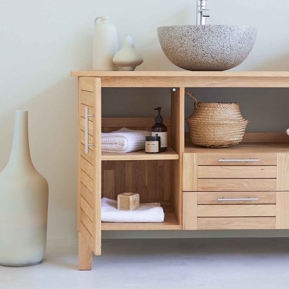 Banyo Lavabo Dolabı, doğal meşe kaplama ile birlikte el işçiliğiyle imal edilir. Natural mat cila uygulaması yapılır. Lavabo ve ayna fiyata dahil değildir. Tezgah üstü ve ya kase lavabolar için uyarlanabilir.