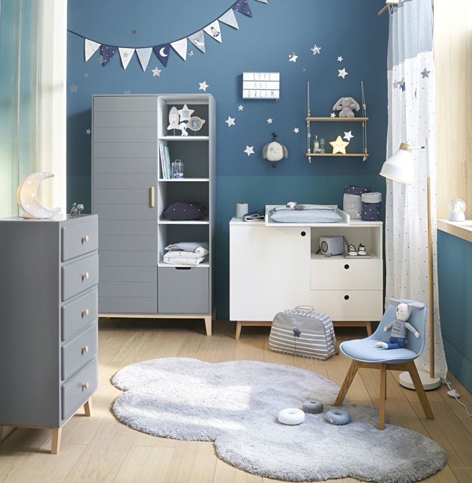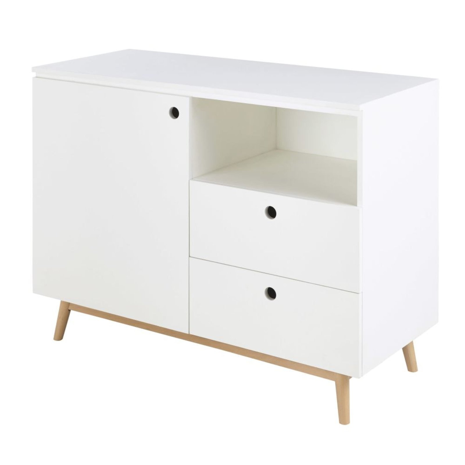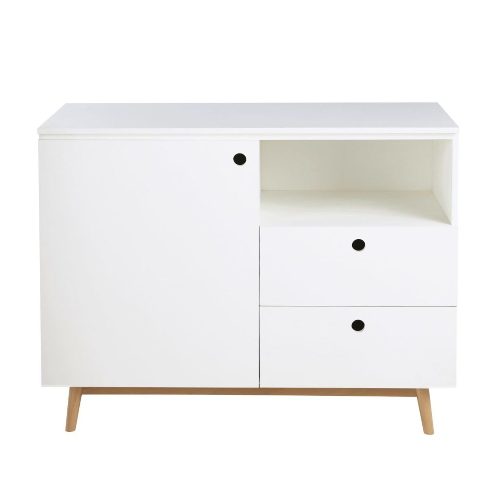 Çocuk odası Şifonyer & Çekmeceli, beyaz kısımlar parlak melamin kaplı MDF yonga plakadan, ahşap kısımlar doğal, masif köknar ağacından imal edilir.