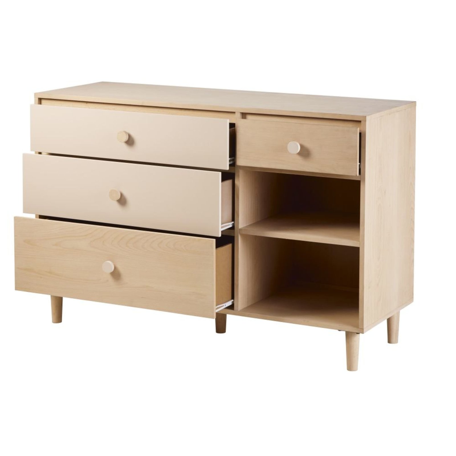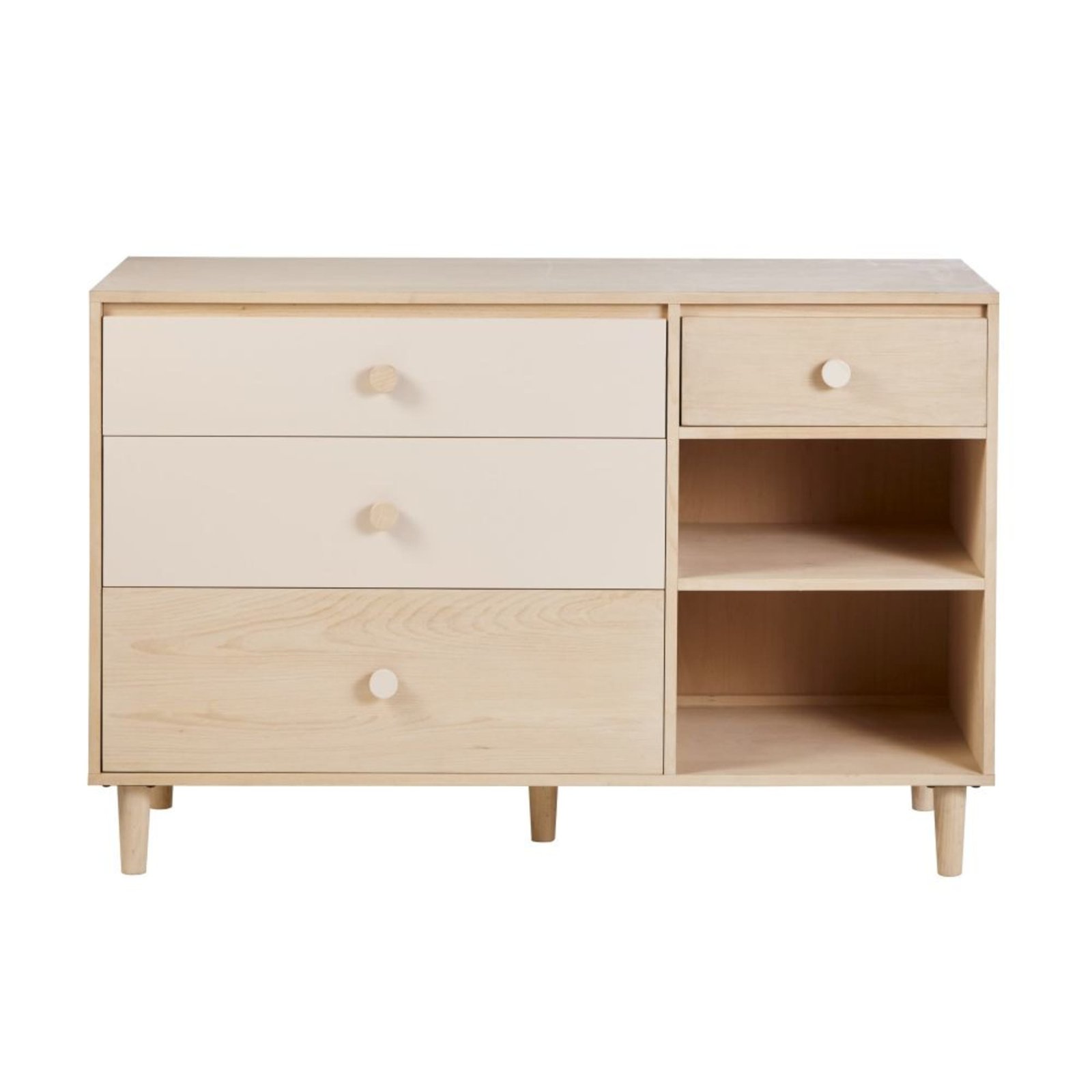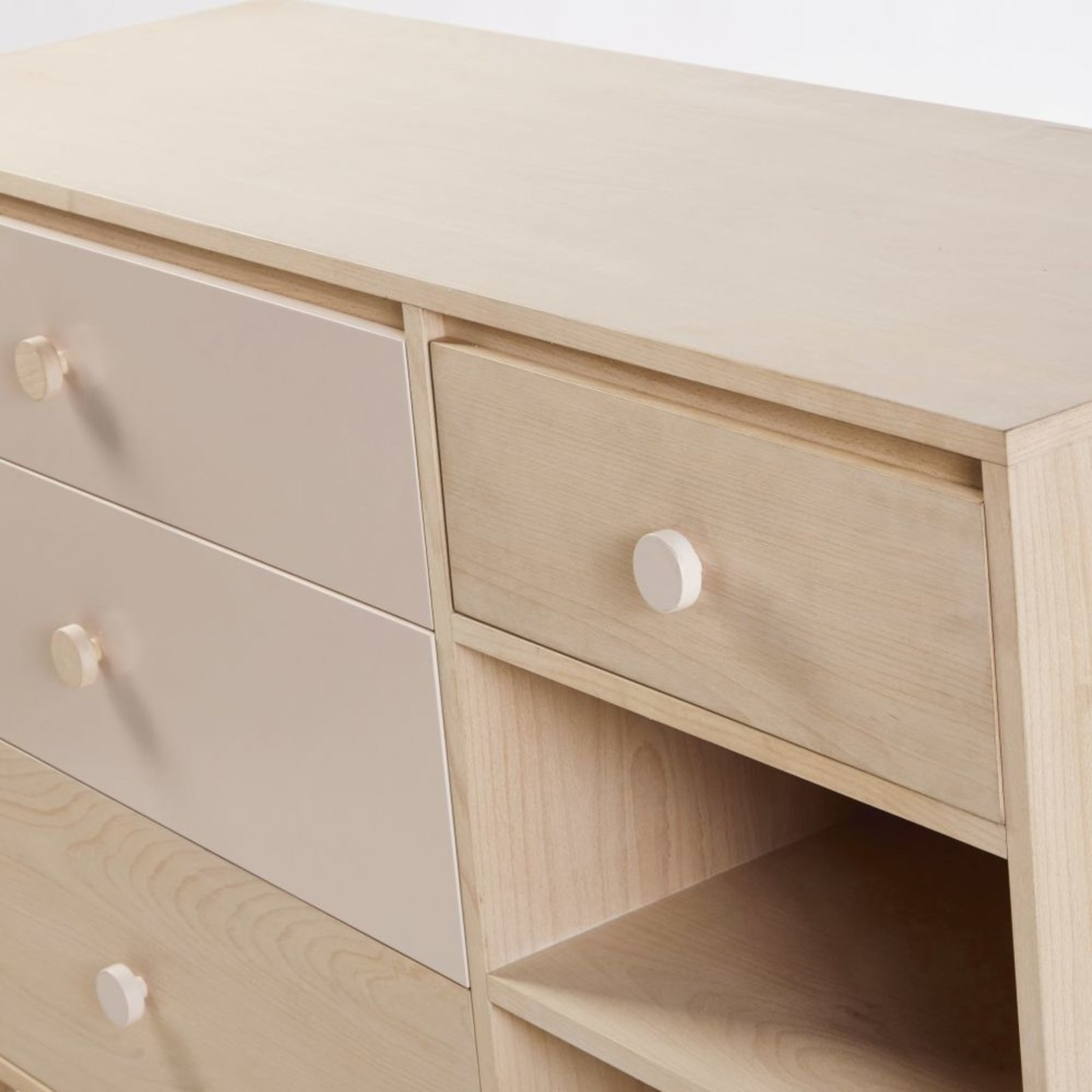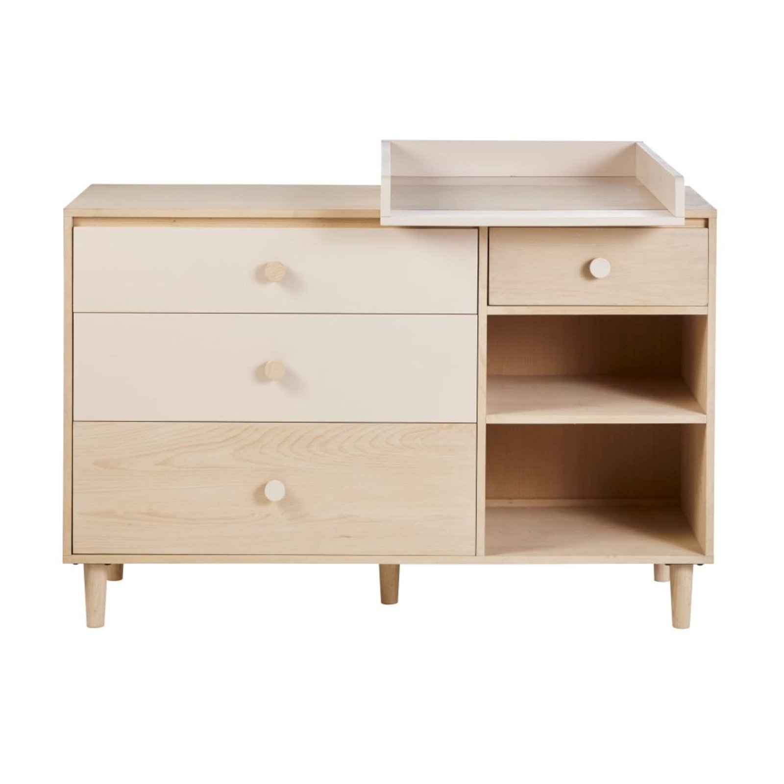 Çocuk odası Şifonyer & Çekmeceli, beyaz kısımlar parlak melamin kaplı MDF yonga plakadan, ahşap kısımlar MDF yonga plaka üstü doğal ahşap kaplamalı olarak imal edilir.