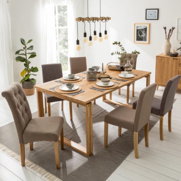 Yemek Masası tablası, masif meşe ağacı ve doğal meşe kaplamadan mat cilalı olarak el işçiliği ile imal edilir. Ayaklar, demir profilden statik fırın boyalı olarak imal edilir. 4-6 Kişiliktir.